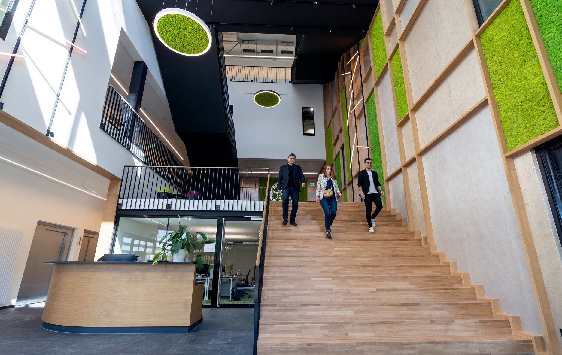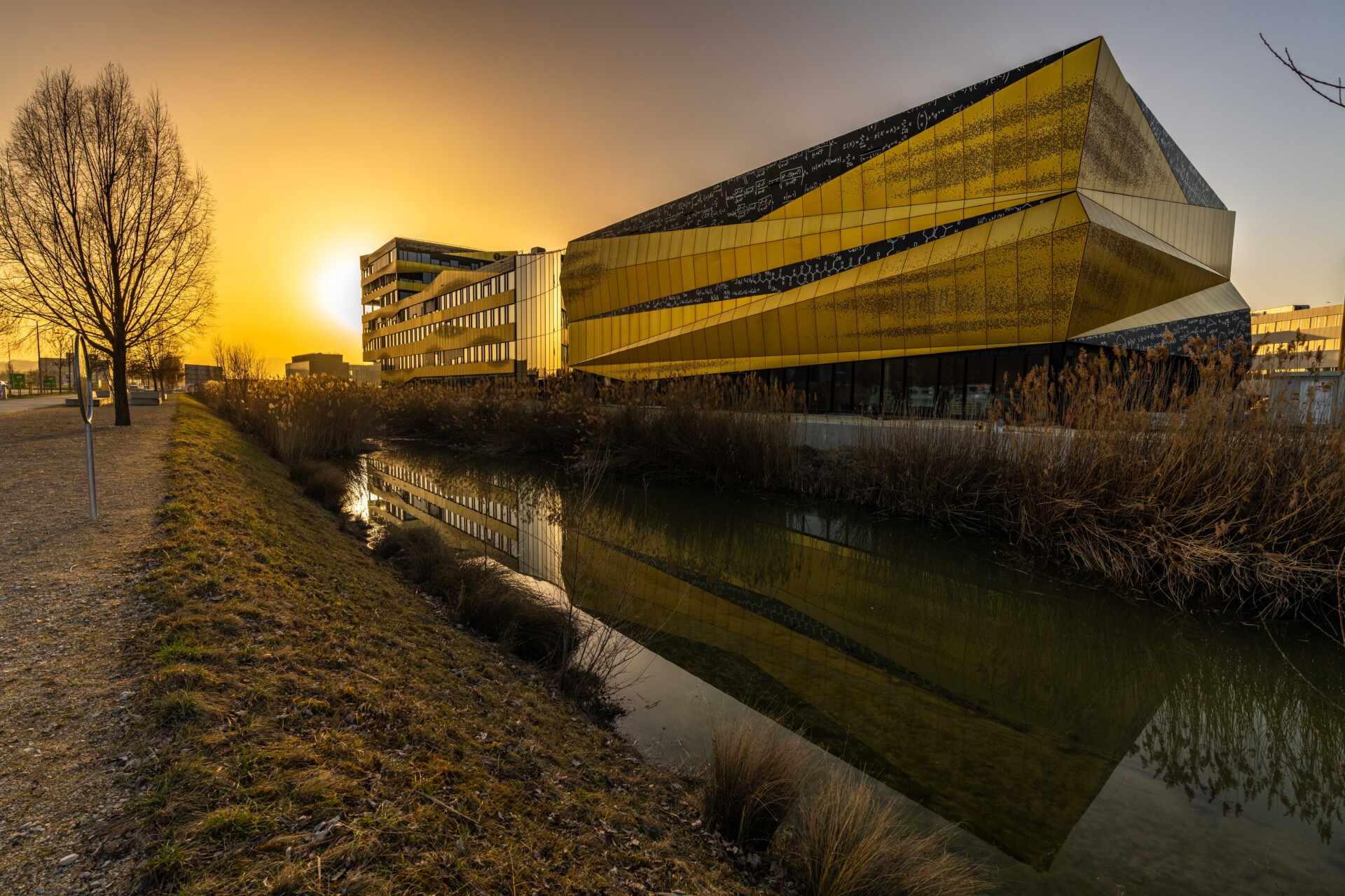 Un bâtiment en bois avec un concept énergétique innovant et comportant tous les derniers standards comme Minergie P, toit et fleurs solaires, batterie et arbre à vent.